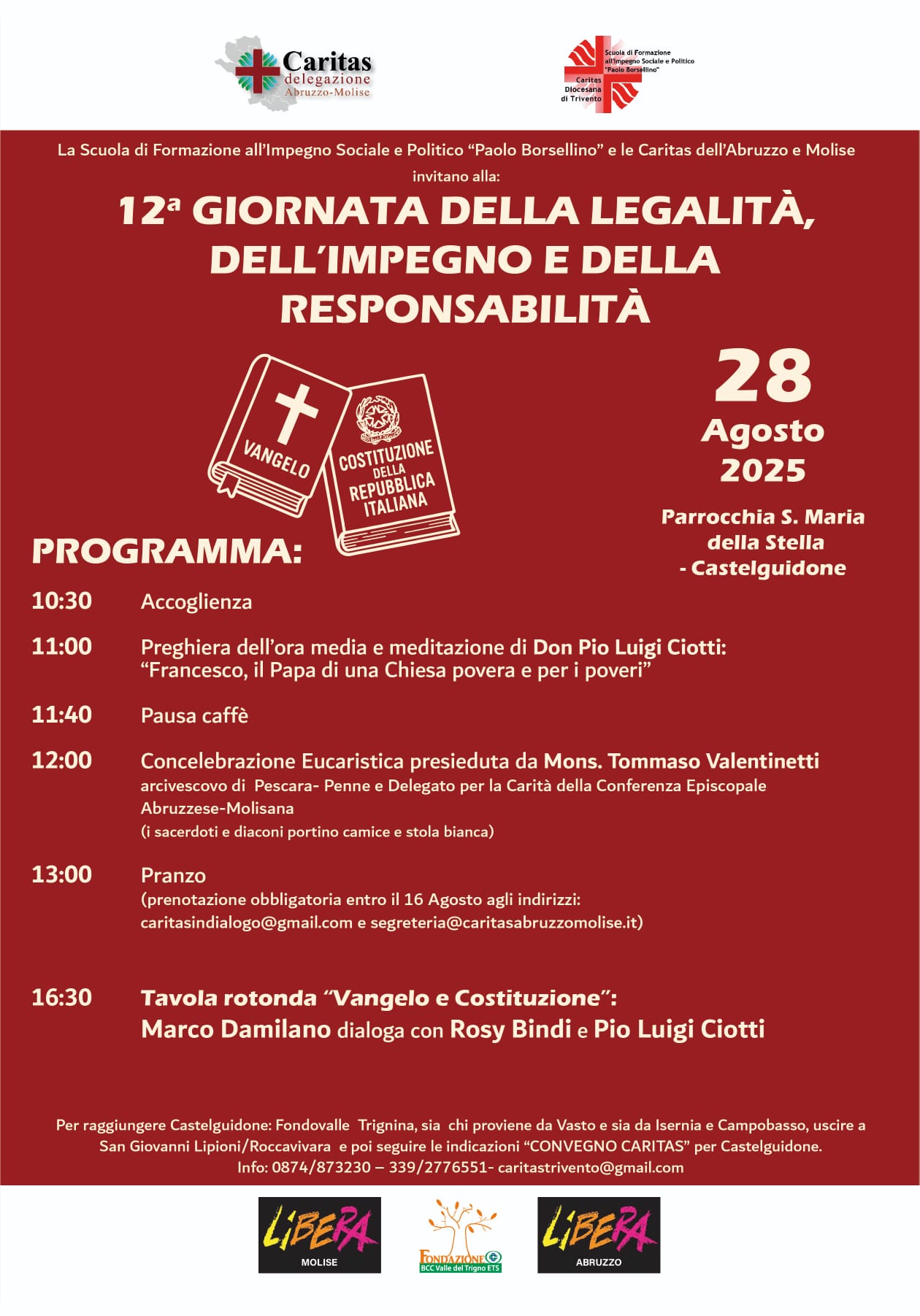 Sarà Castelguidone, piccolo borgo dell’Alto Vastese, a ospitare giovedì 28 agosto la 12ª Giornata della Legalità, dell’Impegno e della Responsabilità, promossa dalla Scuola di Formazione all’Impegno Sociale e Politico “Paolo Borsellino” di Trivento, insieme alla DELEGAZIONE CARITAS ABRUZZO-MOLISE. Un appuntamento che ogni anno rinnova l’impegno delle comunità ecclesiali e civili per una società più giusta, fondata sui valori della Costituzione e del Vangelo.