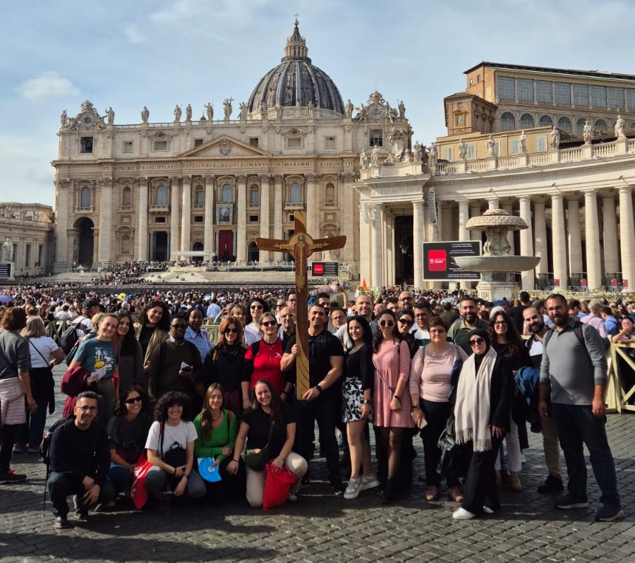 2 novembre 2025. Il gruppo di PeaceMed in piazza San Pietro. Il saluto di papa Leone: